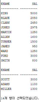 emp 테이블에서, 칼럼명이 ename, sal 인 열을 출력하는 상황.