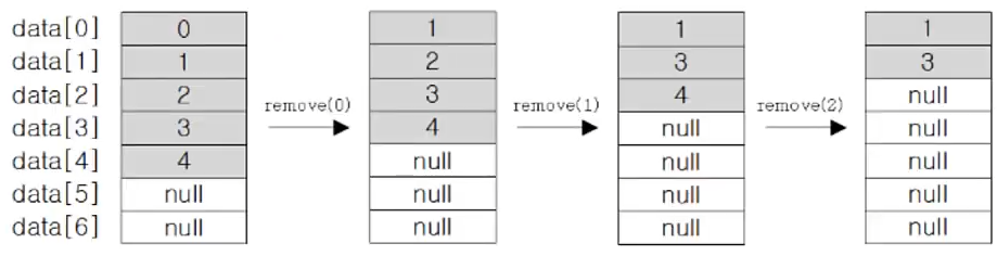 배열리스트 내부의 객체가 삭제 될때마다 한칸씩 올려지면서 결국 데이터가 남게 된다.