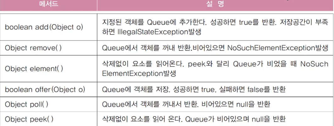 Queue q = new LinkedList(); // Queue 인터페이스의 구현체인 LinkedList를 사용